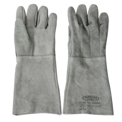 Luva de segurança confeccionada em raspa, tira de reforço externo entre o polegar e indicador, reforço interno na face palmar, costurada com linha de algodão. Punho nos tamanhos 7 cm, 15 cm e 20 cm.