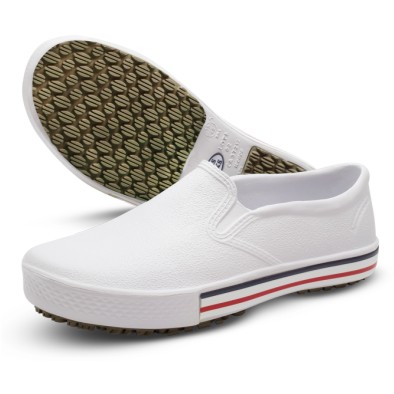 Calçado ocupacional de uso profissional tipo tênis fechado na parte do calcanhar e na parte superior, confeccionado em EVA na cor branca, azul marinho e preta, solado de borracha antiderrapante na cor preta ou bege, resistente ao escorregamento em piso cerâmico com solução de detergente e piso de aço com solução de glicerol, resistente ao óleo combustível.